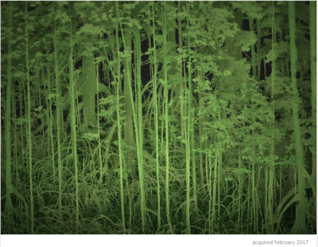 A 3D model of the park’s taller mangroves derived from the Terestrial Laser Scanner (TLS). The TLS shoots laser pulses that can measure distance to an object allowing for three dimensional reconstruction of forests.