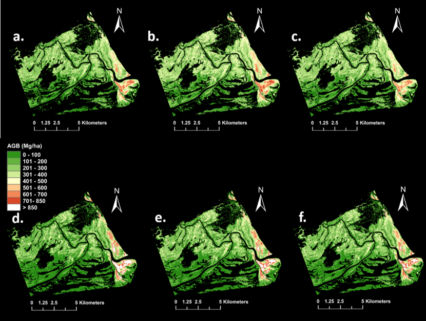 Figure 1. Zambezi Delta mangrove AGB maps derived from different allometric models. a) Chave linear, b) Komiyama linear, c) Njana linear, d) Chave power, e) Komiyama power, f) Njana power; from Fatoyinbo et al. (in review)