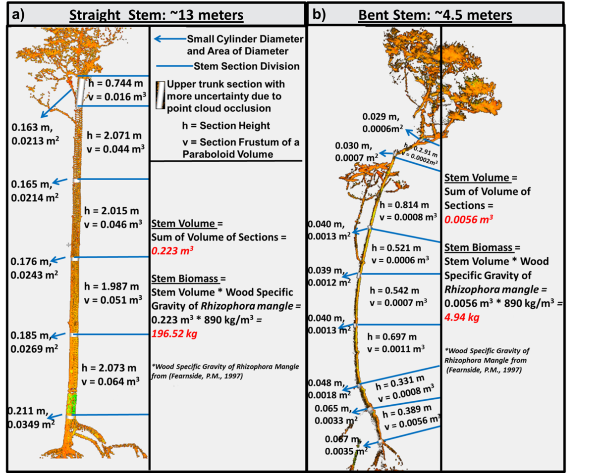 The main advantage of a Terrestrial Laser Scanner (TLS) survey is its ability to capture a 3-D image of the forest structure. Several studies have shown that TLS can measure vegetation parameters such as Diameter-at-Brest-Height (DBH), tree height, leaf area index (LAI), and non-explicit parameters such as wood-to-total-tree area, leaf-to-total-tree area, basal area, stem density, and Aboveground Biomass (ABG) in juvenile trees. Some of the first TLS measurements in mangroves forests were collected in the Everglades (Figure below).